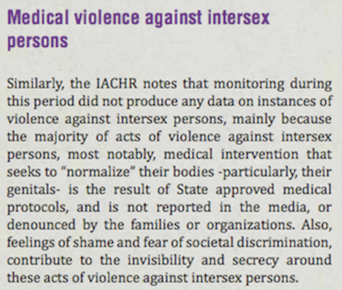 “Del mismo modo, la CIDH, observa que la vigilancia durante este periodo no produjo ningún dato sobre los casos de violencia contra personas intersexuales, principalmente porque la mayoría de los casos de violencia contra personas intersexuales, sobre todo, la intervención médica que busca “normalizar” sus cuerpos –particularmente, sus genitales- es el resultado de protocolos médicos autorizados por el Estado, y no es reportado en los medios de comunicación, ni denunciado por las familias u organizaciones. También, los sentimientos de vergüenza y miedo a la discriminación social, contribuyen a la invisibilidad y secreto alrededor de estos actos de violencia contra las personas intersexuales.”