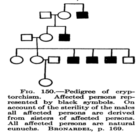 “La conclusión eugenésica es que las cepas del hermafroditismo (hipospadias o criptorquídea [la ausencia de uno o ambos testículos]) solo las pueden poseer las mujeres, y si una de las que tienen estas cepas está casada, probablemente la mitad de sus hijos saldrán defectuosos, particularmente si ya tienen hermanos defectuosos; pero, los hombres normales de aquellas cepas, pueden casarse con mujeres que no posean las cepas afectadas.” (170)