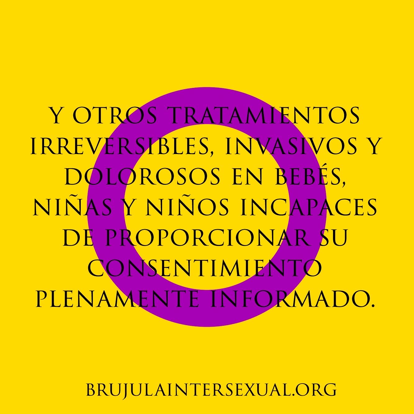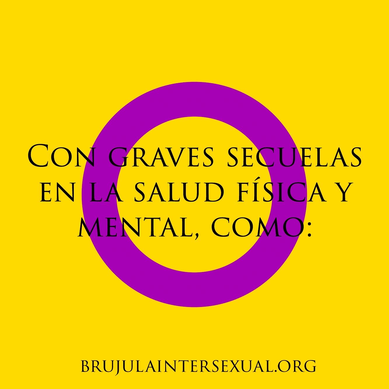El protocolo médico a personas con variaciones intersexuales incluye la realización de cirugías genitales medicamente innecesarias, y otros tratamientos irreversibles, invasivos y dolorosos en bebés, niñas y niños incapaces de proporcionar su consentimiento plenamente informado. Con graves secuelas en la salud física y mental, como: pérdida de sensibilidad genital parcial o total, dolor, infecciones, cicatrices, depresión, ansiedad, y traumas cuyo impacto es similar al producido por abuso sexual.