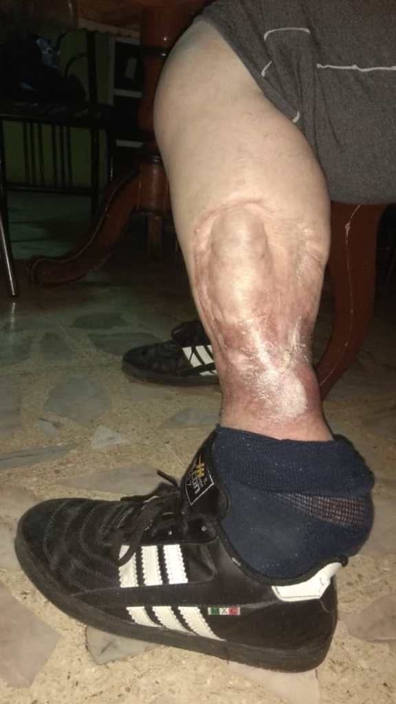 Descripción de imagen: Pierna izquierda de Katia con una gran cicatriz del procedimiento quirúrgico donde quitaron un gran trozo de tejido vascularizado.
