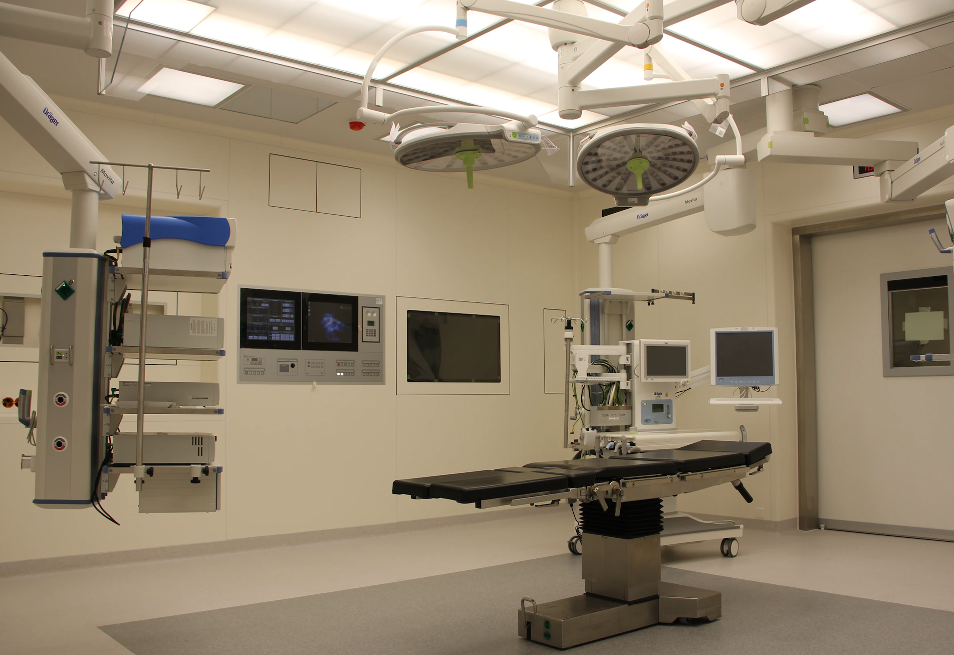 Descripción de imagen: Muestra un quirófano con una mesa de operación negra con gris, monitores y lámparas.