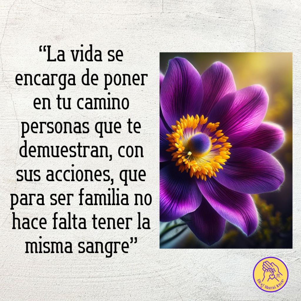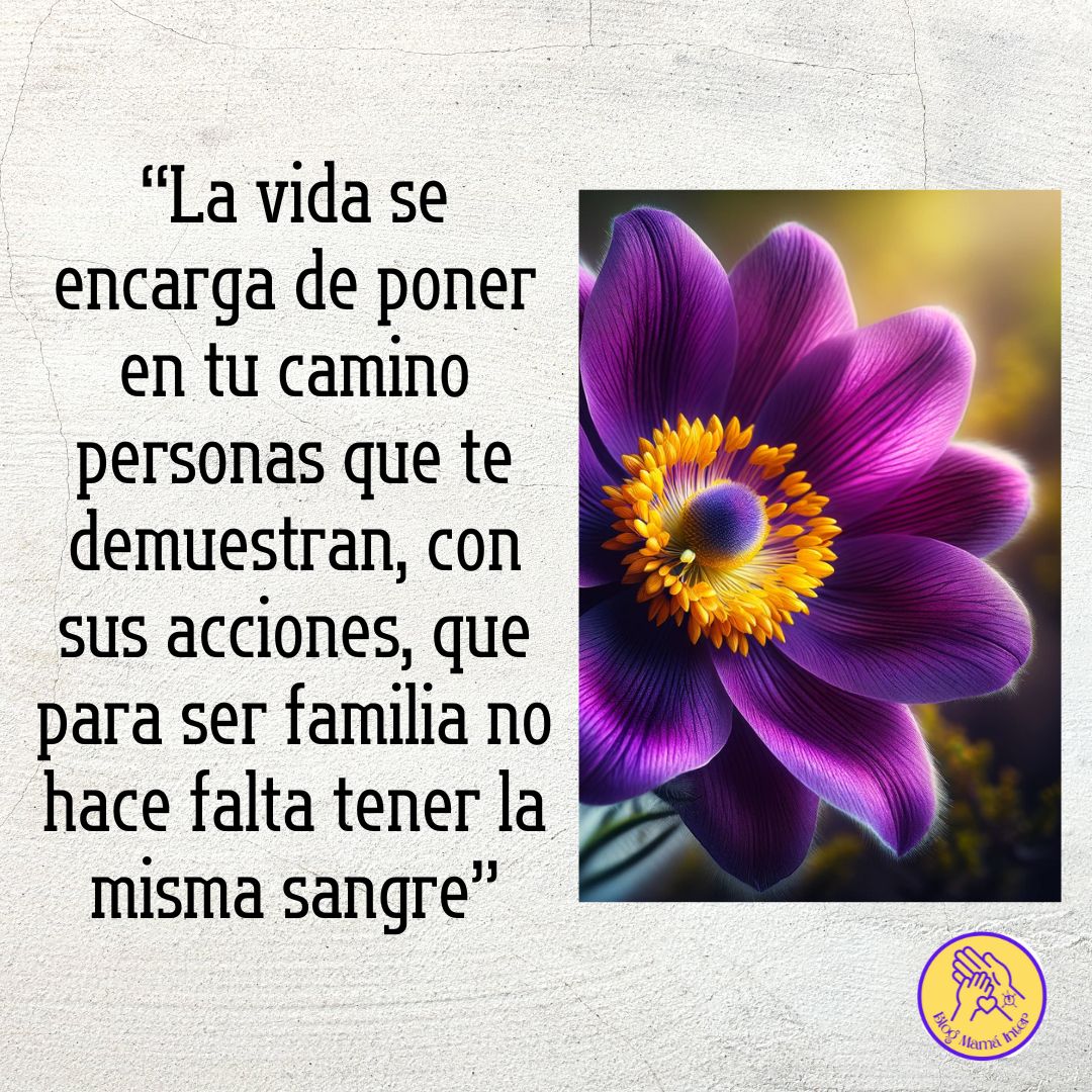Descripción de imagen: A la izquierda, con letras negras dice: “La vida se encarga de poner en tu camino personas que te demuestran, con sus acciones, que para ser familia no hace falta tener la misma sangre”. A la derecha, la imagen de una flor morada con centro amarillo. En la esquina inferior derecha el logo del Blog Mamá Inter