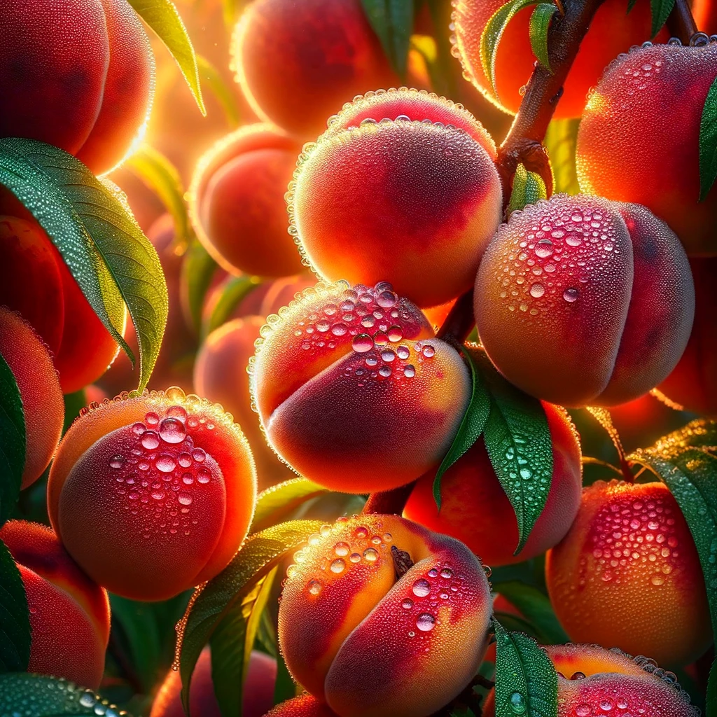 Descripción de imagen: Fotografía de duraznos con gotas de rocío en la rama de un árbol.