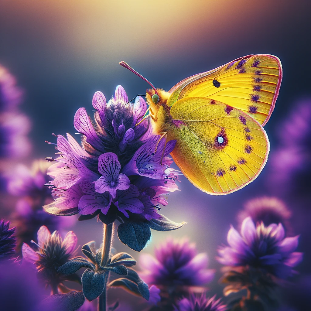 Descripción de imagen: Una mariposa amarilla se posa en una flor color morado.