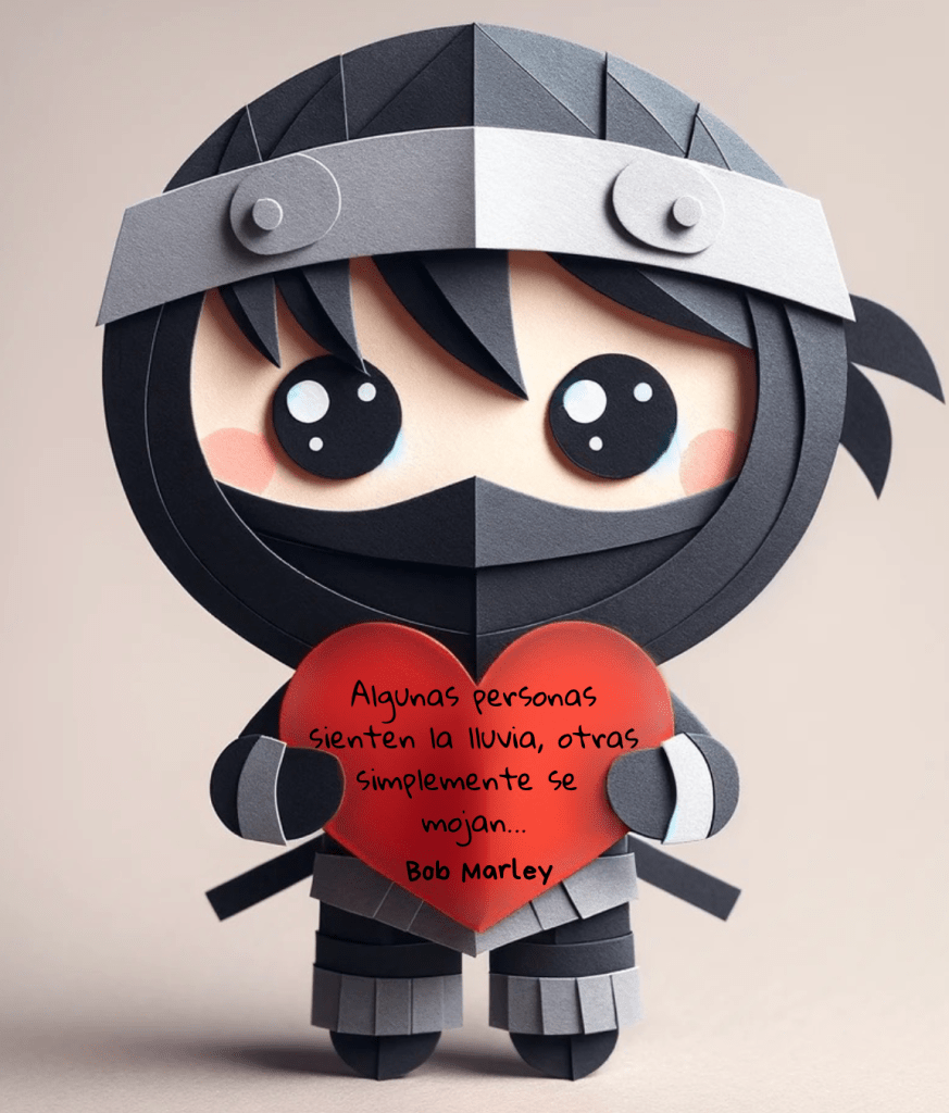 Descripción de imagen: Ninja vestido de color negro hecho de papel, sostiene un corazón rojo. El corazón tiene letras negras que dicen: «Algunas personas sienten la lluvia, otras simplemente se mojan… Bob Marley»