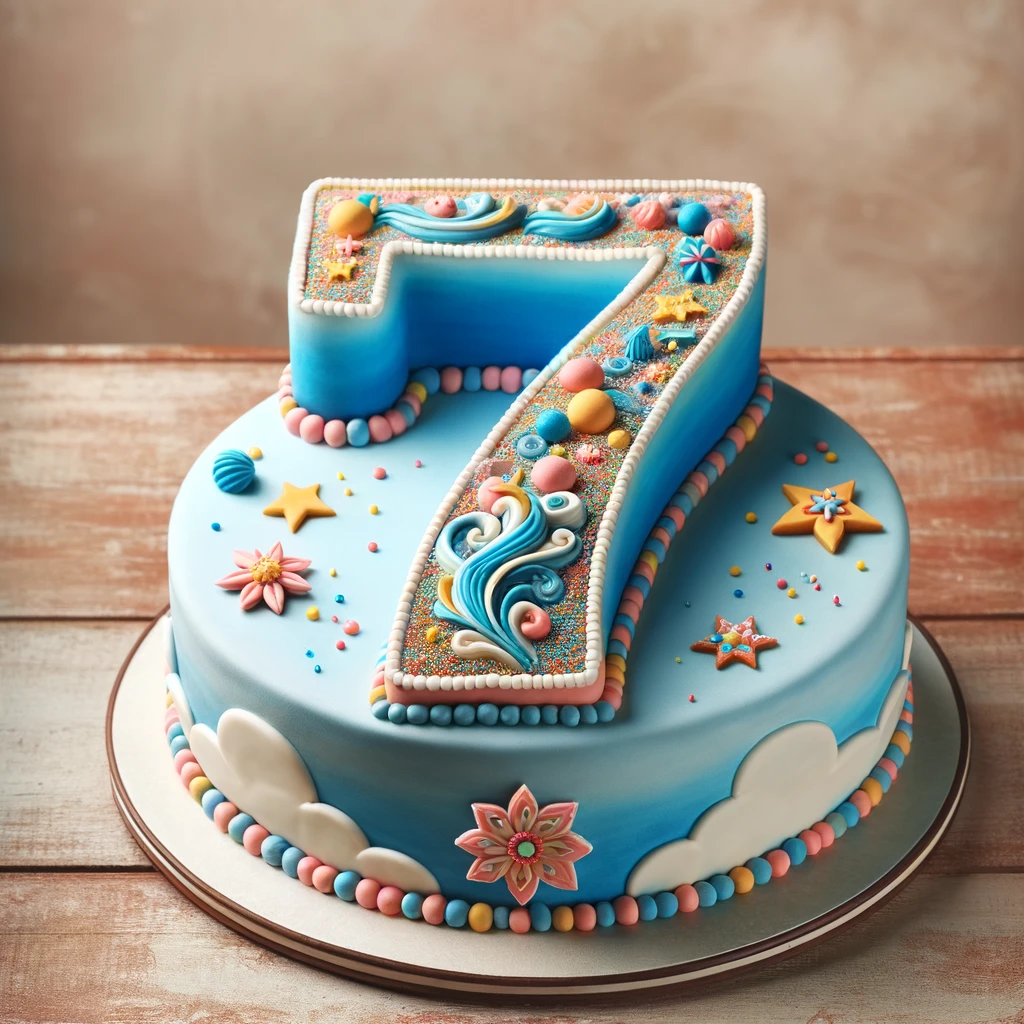 Descripción de imagen: Pastel de cumpleaños color azul, arriba tiene un número 7. Está decorado con detalles de flores y estrellas.
