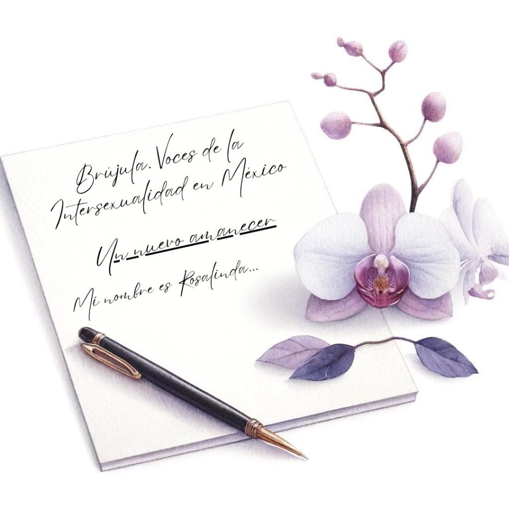 Descripción de imagen: Ilustración de una hoja de papel blanca con letras negras que dicen: «Brújula. Voces de la Intersexualidad en México. Un nuevo amanecer. Mi nombre es Rosalinda…». Encima de la hoja hay una bolígrafo negro. A la derecha de la hoja una orquídea morada.