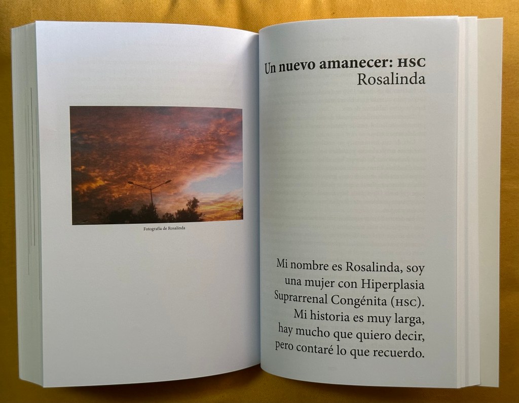 Descripción de imagen: La imagen muestra una página abierta de un libro. En la página izquierda, hay una fotografía de un cielo con nubes de tonos rosa y amarillo. La página derecha inicia un capítulo titulado «Un nuevo amaneces: HSC. Por Rosalinda” y abajo un texto que dice: “Mi nombre es Rosalinda, soy una mujer con Hiperplasia Suprarrenal Congénita (HSC). Mi historia es muy larga, hay mucho que quiero decir, pero contaré lo que recuerdo.