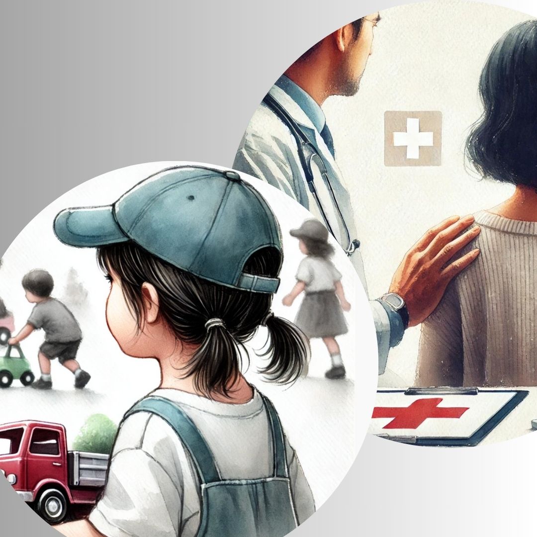 La segunda ilustración, en la parte superior derecha, muestra a una mujer con cabello negro vista desde atrás. La mujer está frente a un médico que la está atendiendo.