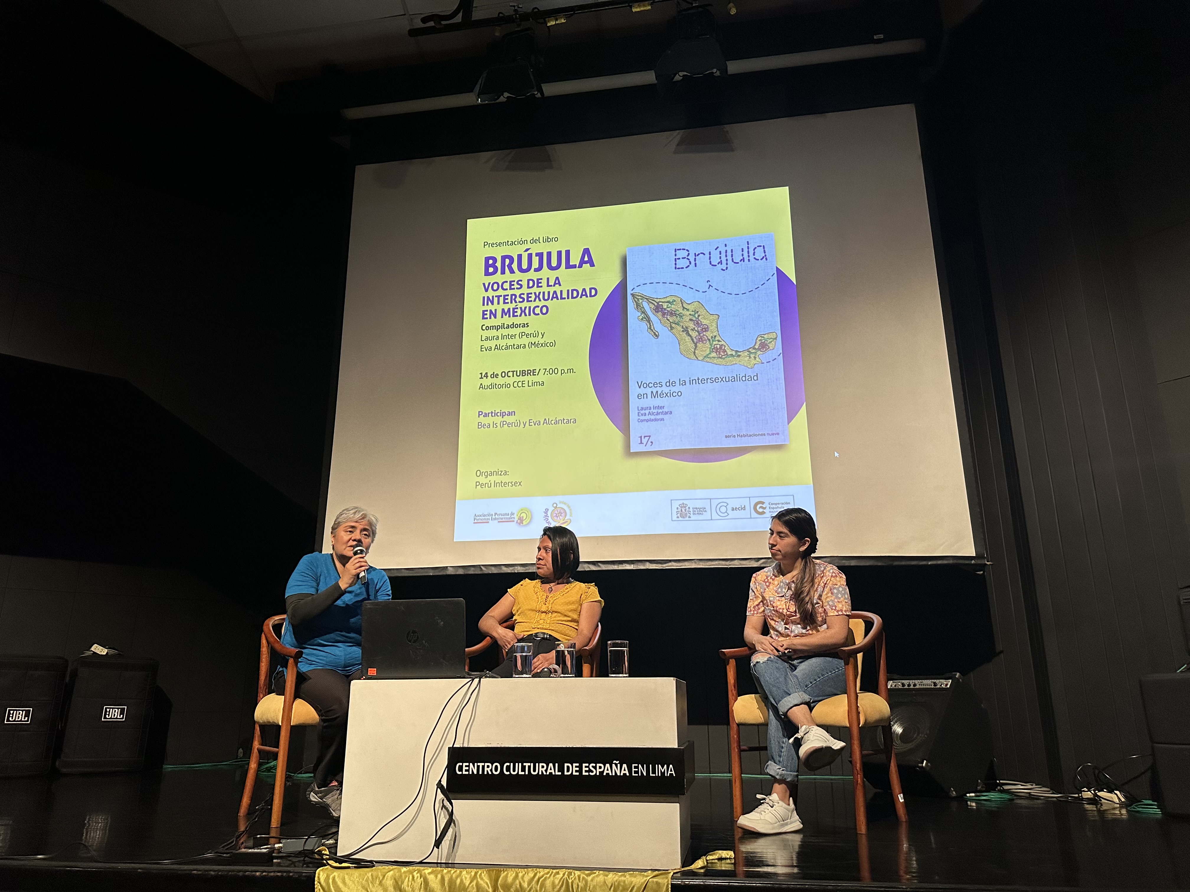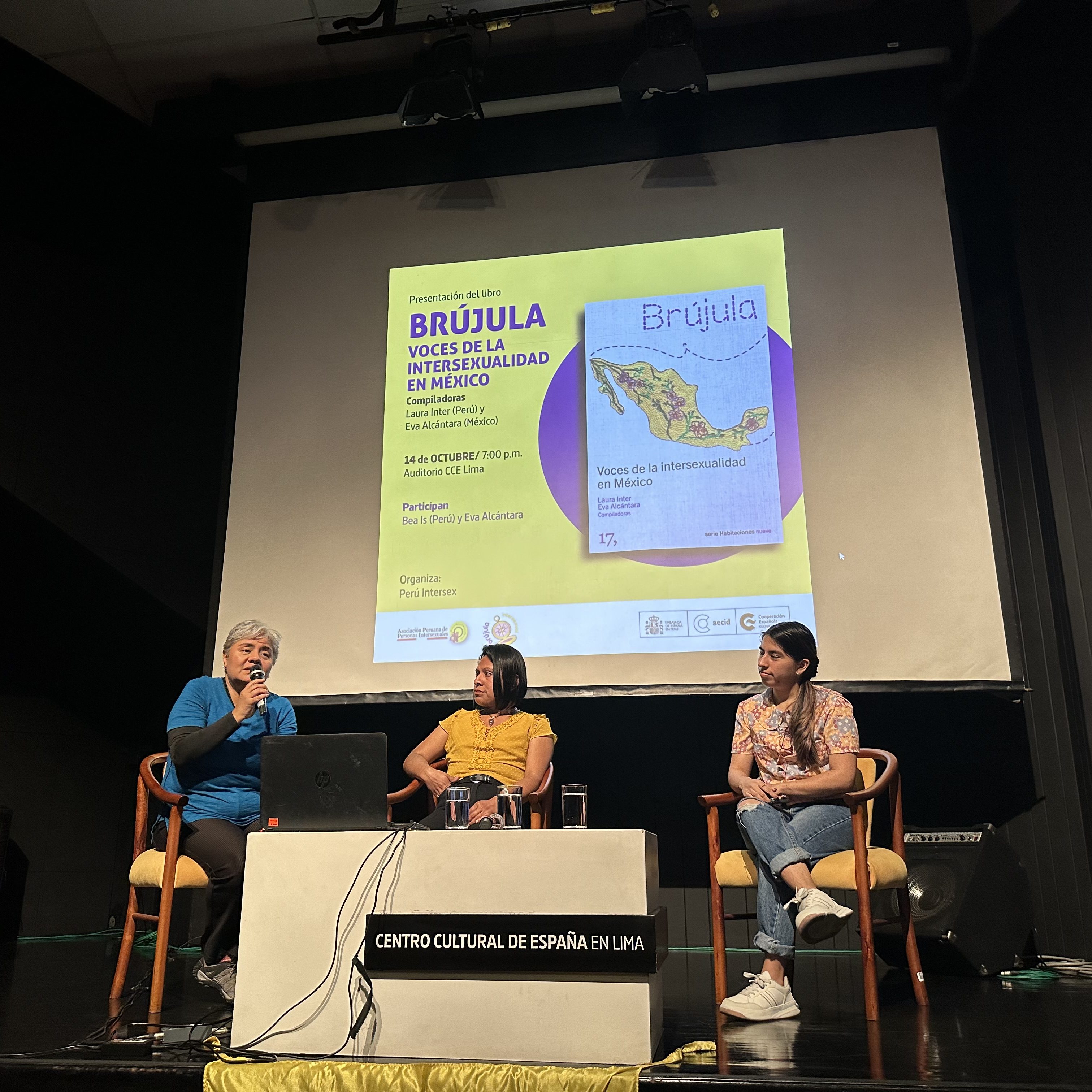 Fotografia de Eva Alcántara y Bea Is, durante el conversatorio en el Centro Cultural de España en Lima. Están sentadas y atrás está proyectado el cartel de la presentación que incluye una imagen de la portada del libro y dice: Presentación del libro: Brújula. Voces de la intersexualidad en México. Compiladoras: Laura Inter y Eva Alcántara. 14 de octubre / 7:00 pm. Auditorio CCE Lima. Participan: Bea Is y Eva Alcántara. Organiza: Perú Intersex. Abajo del cartel los logos de Brújula Intersexual, Perú Intersex y del Centro Cultural de España en Lima.
