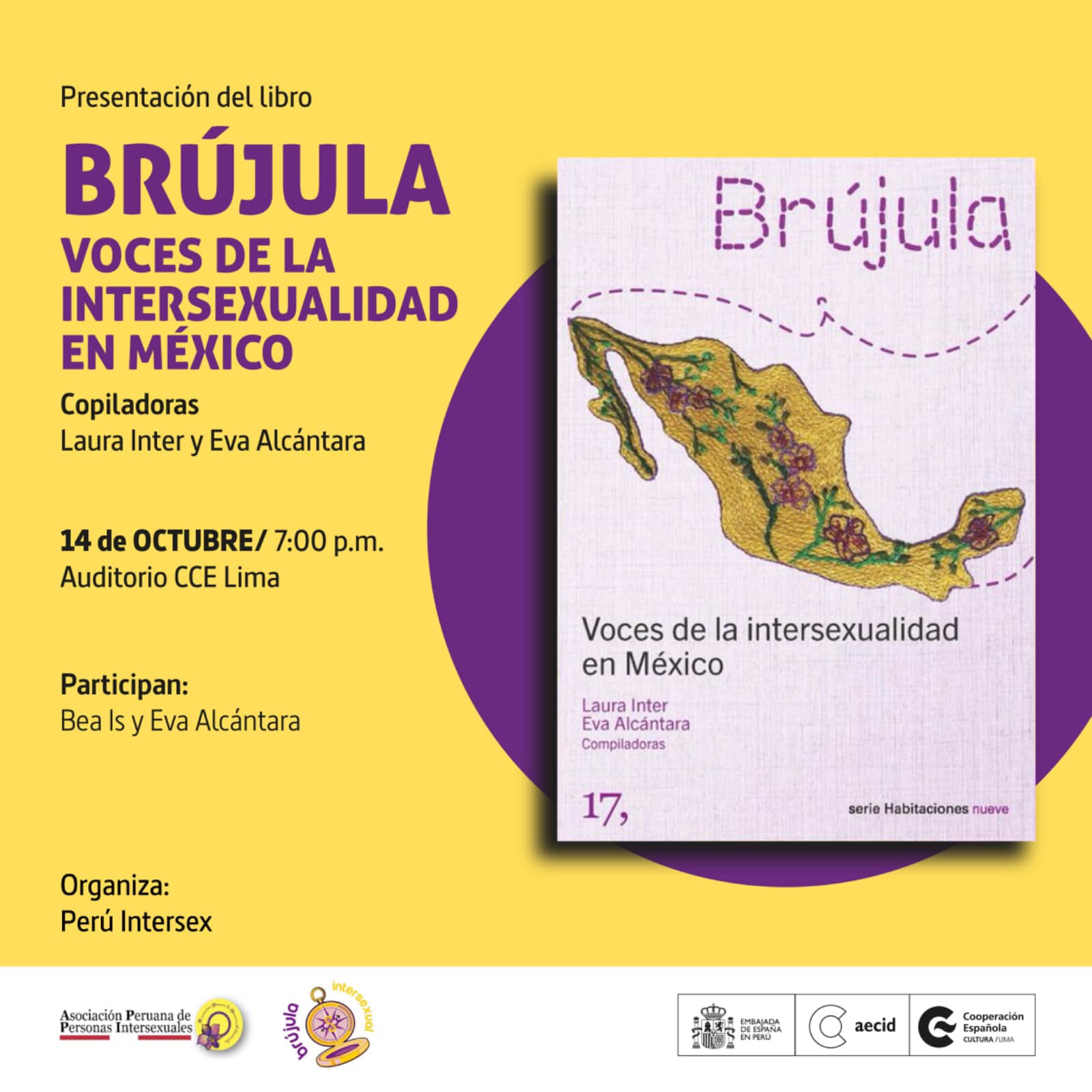 Cartel con fondo amarillo, incluye una imagen de la portada del libro y, con letras moradas y negras, dice: Presentación del libro: Brújula. Voces de la intersexualidad en México. Compiladoras: Laura Inter y Eva Alcántara. 14 de octubre / 7:00 pm. Auditorio CCE Lima. Participan: Bea Is y Eva Alcántara. Organiza: Perú Intersex. Abajo del cartel los logos de Brújula Intersexual, Perú Intersex y del Centro Cultural de España en Lima.