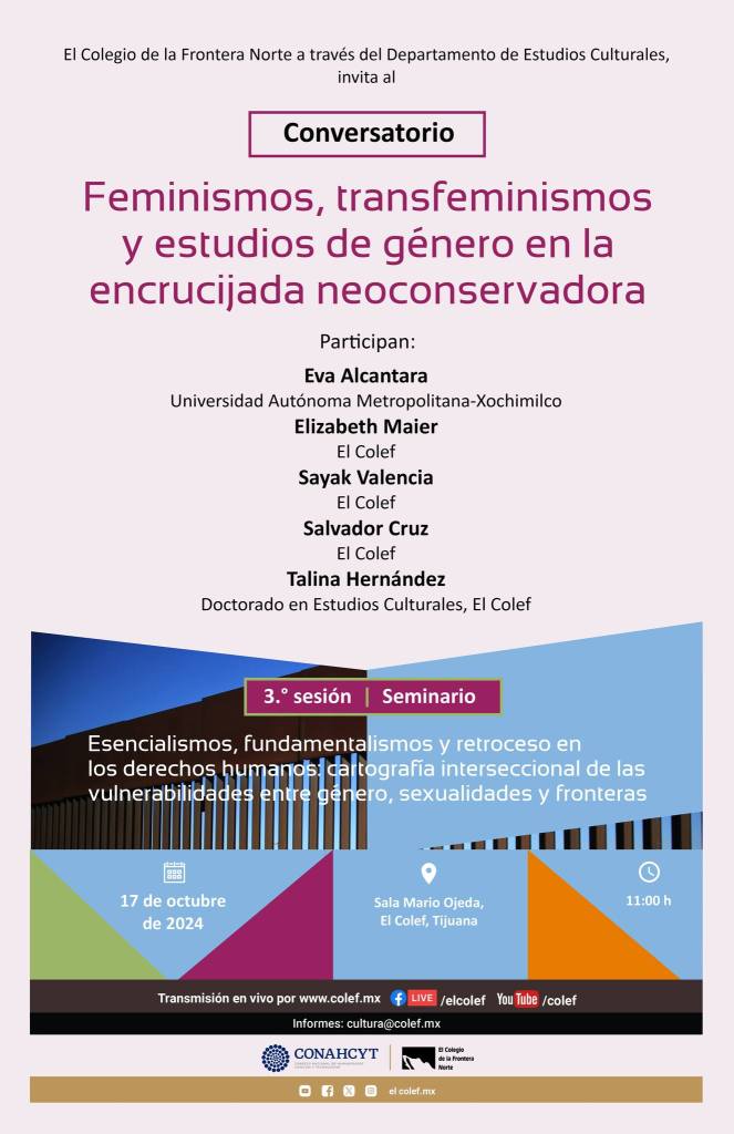 Cartel con información sobre el conversatorio. Arriba dice: El Colegio de la Frontera Norte a través del Departamento de Estudios Culturales, invita al Conversatorio Feminismos, transfeminismos y estudios de género en la encrucijada neoconservadora. Participan: Eva Alcántara (UAM-Xochimilco), Elizabeth Maier (El Colef), Sayak Valencia (El Colef), Salvador Cruz (El Colef), Talina Hernández (Doctorado en Estudios Culturales, El Colef). 3ra sesión, Seminario. Esencialismos, fundamentalismos y retroceso en los derechos humanos:cartografía intersección de las vulnerabilidades entre género, sexualidades y fronteras. 17 de octubre de 2024. Sala Mario Ojeda, El Colef, Tijuana. 11:00 h. Abajo los logos de CONAHCYT y El Colegio de la Frontera Norte.