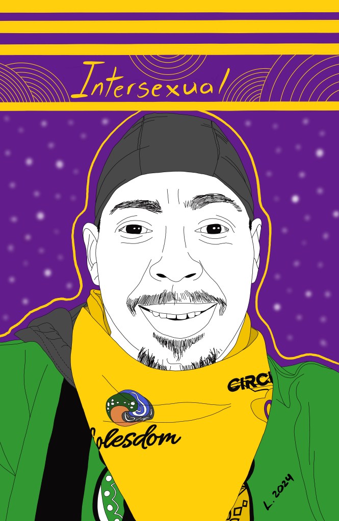 Descripción de imagen: La imagen es una ilustración de un retrato del activista intersexual de República Dominicana, Agustín Rojas. Está en un fondo morado con pequeños puntos blancos que simulan estrellas. Encima del retrato, se encuentra la palabra «Intersexual» escrita en amarillo. El retrato está delineado en blanco y negro, Agustín viste de color verde y lleva una pañoleta amarilla alrededor del cuello con el logo de COLESDOM. En la esquina inferior derecha de la imagen se puede leer «L.2024», que es la firma de Laura Inter como ilustradora.