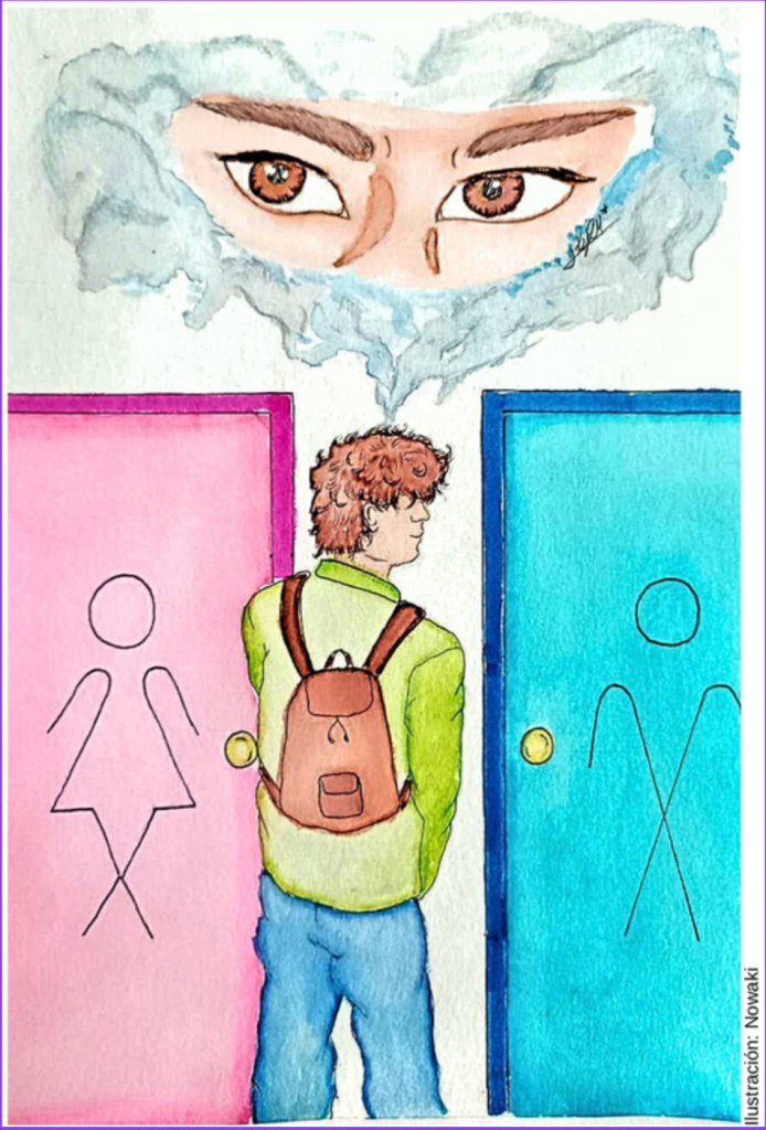 Descripción de imagen: Muestra a una persona de espaldas, con mochila y ropa casual, parada frente a dos puertas de baño: una rosa con el símbolo convencional de mujer, y otra azul con el de hombre. Encima de la persona, dentro de una nube gris, se dibujan unos ojos que la observan con intensidad, transmitiendo una sensación de vigilancia o juicio.