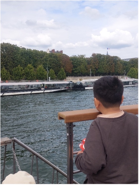 Descripción de imagen: La imagen muestra a un niño de espaldas observando un río desde la barandilla de una embarcación. Sostiene un pequeño juguete rojo en las manos mientras mira hacia la orilla, donde se ven árboles frondosos y embarcaderos alineados. El cielo está parcialmente nublado.