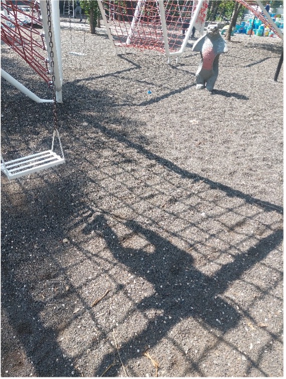 Descripción de imagen: La imagen muestra un área de juegos infantiles al aire libre. En primer plano se ve la sombra de una estructura metálica con redes y un columpio vacío, proyectada sobre el suelo cubierto de grava. Al fondo hay más juegos y un figura decorativa con forma de animal.