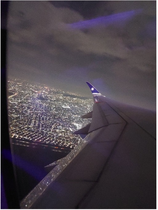 Descripción de imagen: La imagen muestra una vista nocturna desde la ventanilla de un avión en pleno vuelo. Se observa el ala iluminada tenuemente y, al fondo, una ciudad llena de luces que forman una trama de calles y avenidas. El cielo está parcialmente nublado.