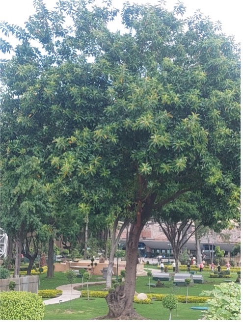 Descripción de imagen: La imagen muestra un parque bien cuidado con senderos de cemento, césped verde y árboles frondosos. En primer plano destaca un gran árbol de tronco grueso y copa amplia, rodeado de pequeños arbustos y áreas ajardinadas. Al fondo se observan personas paseando y algunos edificios