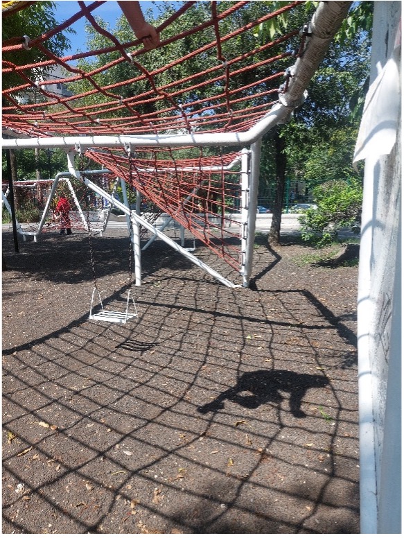 Descripción de imagen: La imagen muestra un área de juegos al aire libre, con estructuras de cuerdas rojas sostenidas por tubos metálicos blancos. En primer plano hay un columpio vacío y, sobre el suelo cubierto de grava, se proyectan las sombras de las redes y de un niño que parece estar trepando.