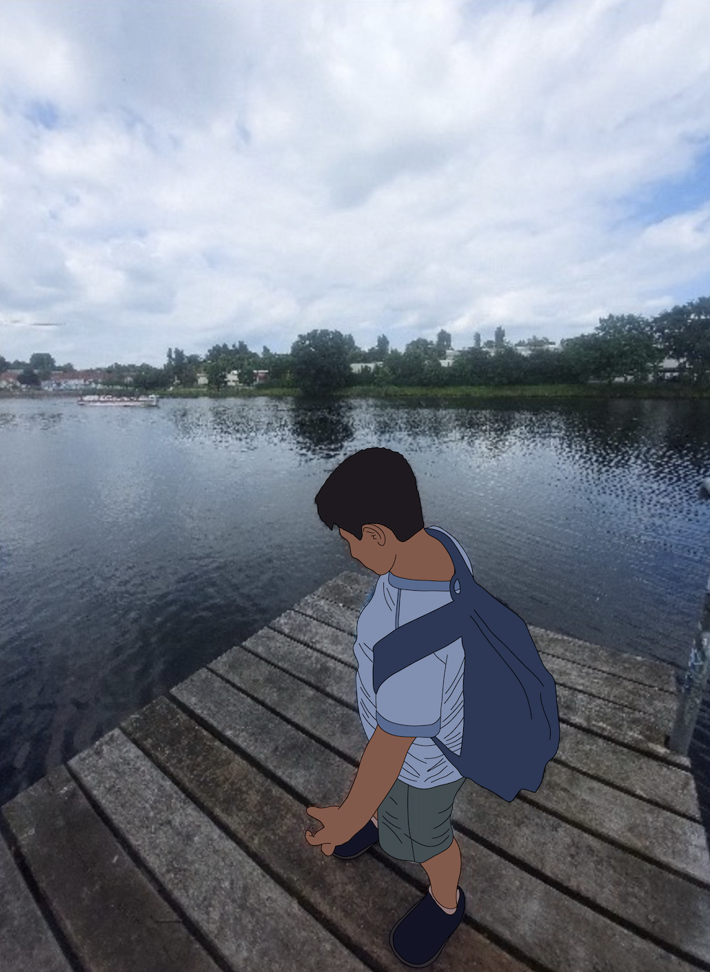 Descripción de imagen: La imagen muestra a un niño representado en estilo de caricatura de pie sobre un muelle de madera, mirando hacia el agua. Lleva puesta una mochila azul y ropa en tonos claros. El entorno —el lago, los árboles y el cielo parcialmente nublado— conserva un aspecto realista.