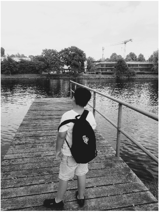 Descripción de imagen: La imagen en blanco y negro muestra a un niño de pie sobre un muelle de madera que se adentra en un cuerpo de agua. Lleva una mochila negra y mira hacia el horizonte, donde se ven árboles y algunos edificios, junto con una grúa de construcción.