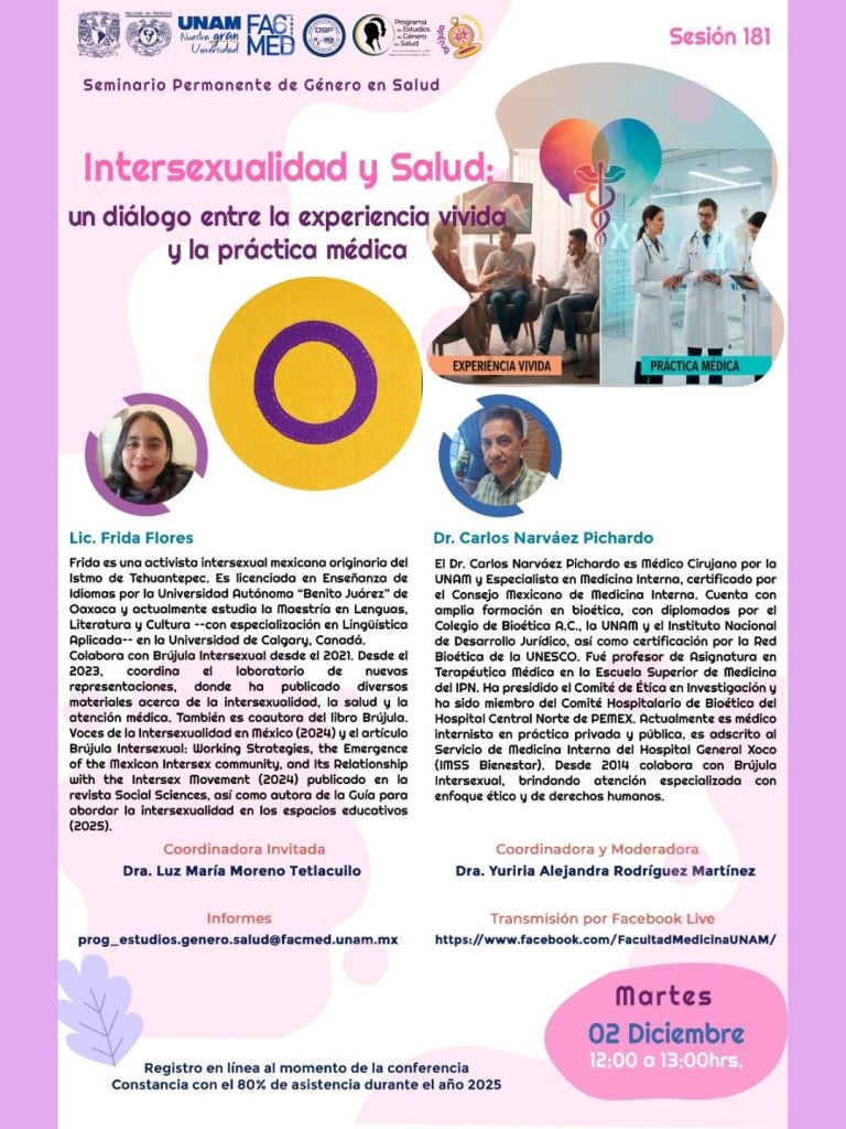 El martes 2 de diciembre tuvimos la oportunidad de participar con la conferencia “Intersexualidad y Salud: un diálogo entre la experiencia vivida y la práctica médica”, en la Facultad de Medicina de la UNAM.