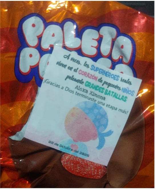 Ese día justo íbamos pasando por ahí y vimos a la nena con su vestido rosa, y sus papás estaban regalando paletas payaso, con un mensaje muy emotivo donde agradecían por la vida de su hija y por haber concluido una etapa tan importante en su camino.